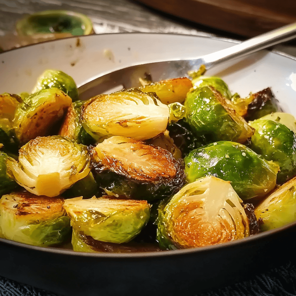 I prepare this dish by heating a pan until it’s sizzling hot, then tossing in the Brussels sprouts, their edges crisping up as they sear. The aroma of caramelized sprouts fills the air, rich and inviting. I season them just right, watching as they develop a deep golden-brown color. With a final toss, they’re ready—tender on the inside, perfectly crisp on the outside.